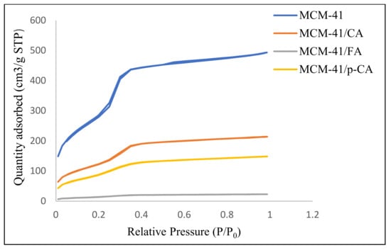 Adsorption isotherms recorded on materials MCM41, MCM-41/CA, MCM-41/p-CA and MCM-41/FA.