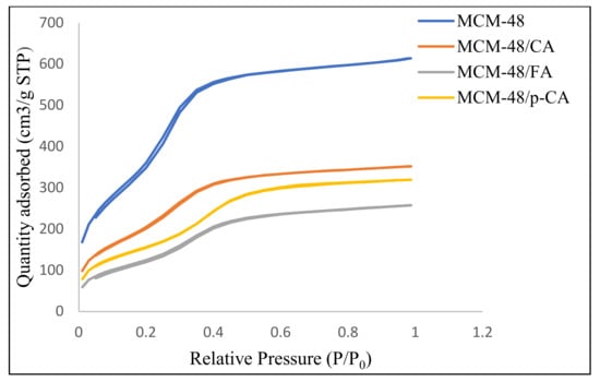 The nitrogen adsorption/desorption isotherms (Figure 5) of the mesoporous materials MCM-48, MCM-48/CA, MCM-48/p-CA and MCM-48/FA, in the range of relative pressures (p/p0) 0.01–0.99, show type IV isotherms and show a stage of condensation in the relative pressure range of 0.2–0.3 which is correlated with capillary condensation in the pores of mesoporous materials.