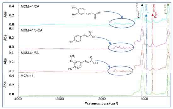 In the case of MCM-41/CA and MCM-41/FA, these shifts are less important, i.e., the shift occurs from 1049.86 and 439.58 cm−1 to 1054.54 and 441.18 cm−1 (i.e., 4.68 and 1.6 cm−1) and, respectively, from 1049.86 and 439.58 cm−1 to 1054.67 and 440.36 cm−1 (i.e., 4.81 and 0.78 cm−1). These less-important displacements can be explained by a lower interaction of caffeic and trans-ferulic acids with the mesoporous matrix.
