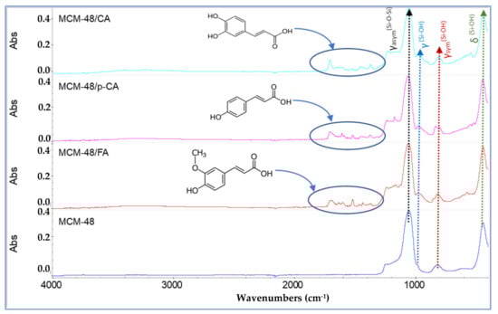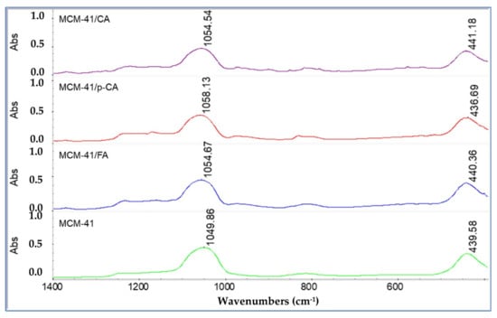 The loading of the mesoporous material MCM-41 with p-coumaric acid induces significant shifts of the MCM-41 characteristic band from 1049.86 and 439.58 cm−1 to 1058.13 and 436.69 cm−1 (i.e., 8.27 and 2.47 cm−1, respectively) (Figure 7).