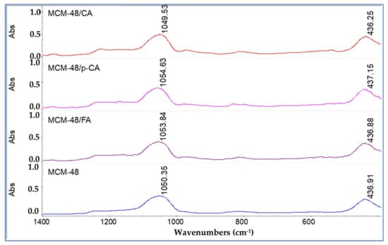 As in the case of the MCM-48 material, the loading of the MCM-48 mesoporous material with the three polyphenols induces changes in the MCM-48 characteristic band from 1050.35 cm−1 and 436.91 cm−1 (Figure 9) at 1049.53 cm−1 and 436.25 cm−1 (i.e., 0.82 cm−1 and 0.68 cm−1) in the case of MCM-48 loading with caffeic acid; at 1054.63 cm−1 and 437.15 cm−1 (i.e., 4.28 cm−1 and 0.24 cm−1) in the case of MCM-48 loading with p-coumaric acid; and from 1050.35 cm−1 and 436.91 cm−1 to 1053.84 cm−1 and 436.88 cm−1 (i.e., 3.49 cm−1 and 0.03 cm−1) in the case of MCM-48 loading with ferulic acid, respectively. These smaller shifts can be explained by a lower interaction of polyphenols with the mesoporous matrix.