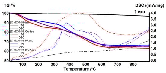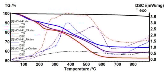 TG–DSC curves for MCM-41, pristine and loaded with polyphenols.