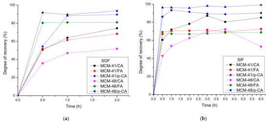 Unlike ferulic acid and caffeic acid, the release profile of p-coumaric acid was fast— the degree of recovery of p-coumaric acid from MCM-41 and MCM-48 was over 90% after the first hour, and this was maintained throughout the release study. Thus, in Figure 14b, the release profile of the MCM-41/p-CA sample in SIF was the fastest and highest, unlike the other samples, the lowest being that of the MCM-41/FA sample in SIF. In Figure 14a, the MCM-48/p-CA sample had the fastest and highest release profile in SGF.