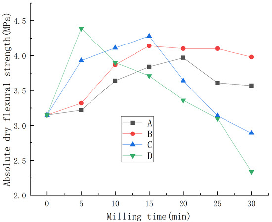 As can be seen from Figure 1, under different mass ratios of material to ball and milling speed, the absolute dry flexural strength of phosphorus building gypsum first increased and then decreased with the increase in milling time. When the mass ratio of material to ball was the same, faster ball milling had a greater influence on the absolute dry flexural strength of phosphorus building gypsum. When the milling speed was the same, a smaller mass ratio of material to ball had a greater influence on the absolute dry flexural strength of phosphorus building gypsum.
