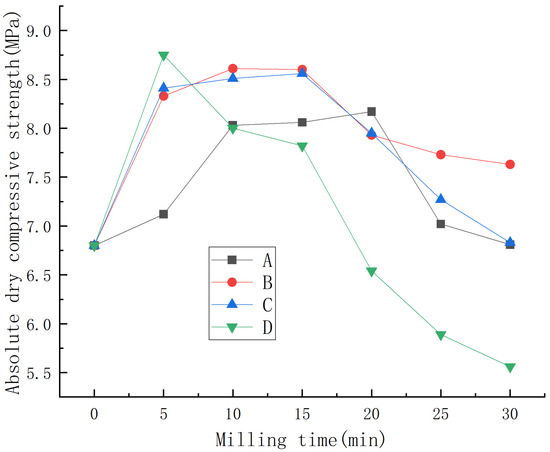 As can be seen from Figure 2, under different mass ratios of material to ball and milling speed, the absolute dry compressive strength of phosphorus building gypsum first increased and then decreased with the increase in milling time. When the mass ratio of material to ball was the same, faster ball milling had a greater influence on the absolute dry compressive strength of phosphorus building gypsum. When the milling speed was the same, a smaller mass ratio of material to ball had a greater influence on the absolute dry compressive strength of phosphorus building gypsum.