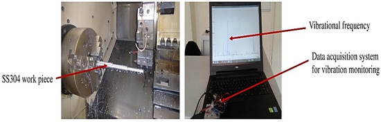To record the vibration behavior with wear, the turning tests were carried out with a vibration sensor attached in the tool holder and the data acquisition system acquires the vibration patterns for both coated and uncoated tool inserts. The experimental setup with SS304 work piece and vibration data acquisition system and vibrational frequency are shown in Figure 1 and Figure 2, respectively.