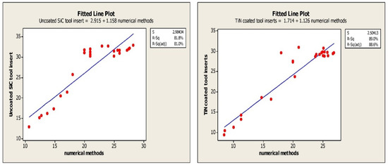 The feed, cutting speed and depth of cut are the machining parameters that are taken in to consideration and the cutting forces in Cartesian coordinates and tool wear are monitored. The flank wear and crater wear are observed in turning tests. The variation in the cutting forces compared to the corresponding machining parameters and depicted in Table 5. The regression equation depicts the significance of flank wear in tool failure. Crater and flank wear for both the SiC tool insert and TiN-coated tool insert exhibits a depth of cut that strongly influences tool failure [18]. The regression for crater wear and flank wear are exhibited in Table 4. The statistical evaluation of errors for experimental values and numerical values are depicted using curve fitting techniques and the results are depicted in Table 4 which portrays the R squared values of experimental vibration frequencies and the Finite element method. The R squared of 81% and 89% are obtained for the experimental and FEM vibrations, respectively. The regression equation correlating machining parameters such as feed rate, speed, and depth of cut shows that wear is the function of machining parameters [19]. The significance of machining parameters in crater wear and flank wear are shown in Table 5.