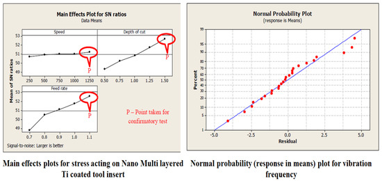 The curve fitting for Coated and Uncoated tool inserts are exhibited in Figure 5. The signal to noise ratio, and curve fitting for coated turning tool inserts are exhibited in Figure 6. The Uncoated turning tool carbide inserts showed the microscopic patches and nucleation of cracks and voids of maximum size crater depth of 0.2 mm. whereas the multilayered Titanium Nitride-coated turning tool inserts showed good wear-resistance properties by 0.07 mm of crater depth and reduction in crack nucleation and voids. Since the wear characteristics of the tool insert is consistent with time, the metal removal time is maintained as constant for both inserts throughout the turning tests. The wear resistance increase produces more cutting forces during the turning operation. This phenomenon leads to a reduction in the stress acting on the tool inserts. The characterization of coating materials defines the behavior of cutting tool stress on the work piece. The stress is calculated based on the cutting forces applied and the cutting tool properties. The finite element technique is adopted to determine the stresses acting on the tool inserts. The flank wear is characterized by the length and crater wear by the width of the workpiece.