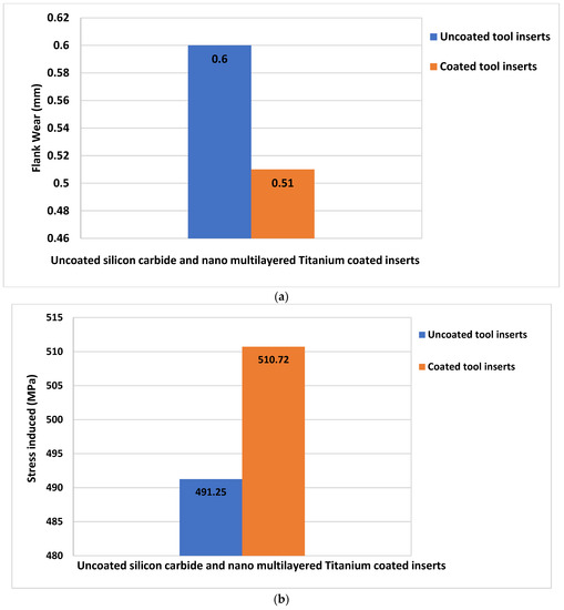 Flank wear and stress characteristics for uncoated and TiN-coated inserts. (a) Reduction of flank-wear for uncoated Silicon Carbide and Nano multilayered Titanium tool inserts. (b) Improvement of cutting tool stress for uncoated and Nano multilayered Titanium-coated inserts.