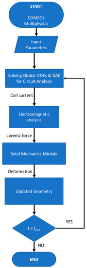 The flow chart shown in Figure 3 represents the numerical model used in the research. The transient current was calculated using a circuit analysis by solving Equation (4) in COMSOL. The current was then passed through the coil to generate an induced magnetic field. Equations (7)–(10) were used to calculate the current density and magnetic flux. For Lorentz force calculation, Equation (11) was used. The magnetic force generated was used as an input load in solid mechanics to deform the workpiece. After the deformation at each time step, the cycle is repeated; hence, the effect of change in the geometry on the inductance of the system is also considered. Once the Lorentz force and inertial force diminish, the numerical analysis ends.