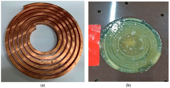 The tool coil was machined out of 10-mm copper plate using 3-Axes CNC Milling (MV-1060 YDPM, Taiwan) with an automatic 24 tool changer. The coil was covered with epoxy resin for reinforcement, as shown in Figure 5. The dimensions and resistivity of the coil are given in Table 4.
