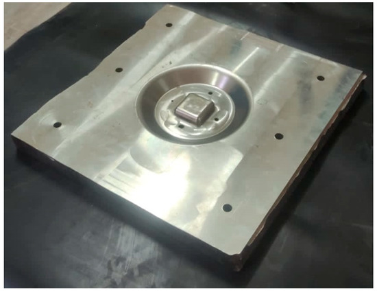 A CNC milling machine was used to machine the die from 300 mm × 300 mm × 40 mm SS304 steel alloy (Figure 6). A middle block of 40 mm × 40 mm with small air vents of 3 mm were also machined and drilled, respectively. The air vents are used to evacuate the entrapped air between the workpiece and die, as shown in Figure 7. The workpiece thickness range, according to the Standard Wire Gauge (SWG), was 25, 19 and 16 (0.5 mm, 1.02 mm and 1.63 mm, respectively).