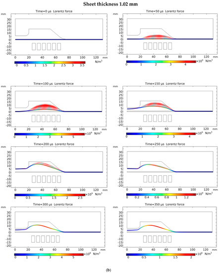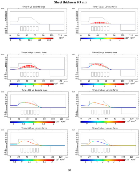 The results obtained from the 3D numerical analysis are shown in this section. The Lorentz force distribution on the workpiece affects the geometry of the sheet. Figure 8 represents the force distribution on the sheets at all conditions at several time steps. From Figure 8, it is observed that the Lorentz forces mainly act on the area of the sheet that is right on top of the coil. The force distribution of the 0.5-mm sheet has the lowest value of 5.7 × 109 N/m3 at the time step at 80 μs. Lorentz force on the 1.02-mm sheet has a maximum value of 6.2 × 109 N/m3 at 85 μ, while that on the 1.63-mm sheet is 7.149 × 109 N/m3 at time step 90 μs. The reason for the shift in time and magnitude of maximum forces on varying sheet thicknesses can be explained by the work of Dordizadeh et al. [28]. The magnitude of the Lorentz force depends on the induced current and magnetic flux; due to varying sheet thicknesses, the induced current varies, which results in varying magnetic pressures. The induced current for thicker sheets has a higher value because of the larger cross-sectional area [29]. Additionally, there are some losses in the form of attractive forces in thicker sheets due to phase shifting between the induced current and eddy current. This shift occurs because, at different depths, the current changes its waveform to penetrate the deeper layers. The Lorentz force on the thicker sheet is the highest, yet its deformation height is lowest; the reason for that is a thicker sheet having more mechanical strength is difficult to deform [28]. From the numerical results of all three conditions, it is observed that the Lorentz force diminishes quickly, and the remaining deformation occurs under the inertial force. This phenomenon was also claimed by Kleiner et al. [30].