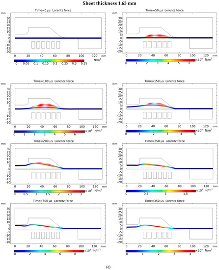 Lorentz force distribution at different time steps: (a) 0.5-mm sheet, (b) 1.02-mm sheet and (c) 1.63-mm sheet.