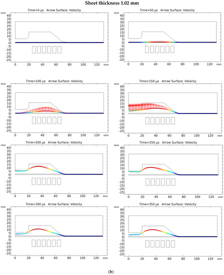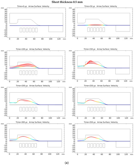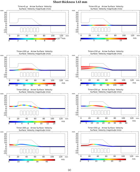 The velocity of the deforming workpiece is dependent on the magnitude of Lorentz’s force. The workpiece deforms under the influence of kinetic energy when Lorentz’s force diminishes [16]. Therefore, it is important to study the velocity distribution on the deforming workpiece. The comparison of velocity distribution at all conditions at several time steps is shown in Figure 9. The 0.5-mm sheet achieved the highest velocity of 200 m/s at time step at 135 μs. The maximum velocity attained by the sheet of 1.02-mm thickness was 180 m/s at time step 150 μs. The velocity of the 1.63-mm-thick sheet was the lowest among the three 160 m/s at time step 165 μs due to its greater mechanical strength [28]. After 200 μs, the velocity changes its direction and reduces significantly because of the sheet and die interaction. The bounce-back velocity of the 0.5-mm sheet at 200 μs was the highest with a 60-m/s magnitude. The 1.02-mm sheet attained a 50-m/s velocity, while the 1.63-mm sheet had a minimum magnitude of 20 m/s. The deformation of the workpiece after the Lorentz force diminishes mainly occurs due to kinetic energy provided to the workpiece by pulsed magnetic pressure. Due to different velocity distributions, the final morphology of the workpiece at all three conditions is also different.