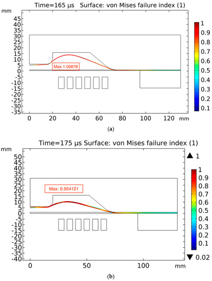 The sheets were evaluated for the estimation of failure using the von Mises failure index. The model presented here is not a fracture mechanics model and cannot be used to predict the exact fracture location, fracture mechanics or crack propagation, which will be incorporated in the future; however, it is an estimation of the ductile deformation of the material. The von Mises failure index is the ratio between the computed flow stress and the given limit, which, in this case, is the experimental results measured by [31]. A failure index equal to or greater than ‘1′ indicates failure of the sheet material. Values lower than ‘1′ lie in the safe zone [20]. The ultimate tensile strength of high-speed forming AA6061-T6 was experimentally measured by A. Manes [31] for failure prediction, and the maximum value was 570 MPa. Figure 11a shows the failure index of the 0.5-mm sheet. The maximum value was 1.00878 at 165 μs, which exceeded ‘1′; hence, according to the failure index, the sheet would fail. From Figure 11b, it can be observed that the 1.02-mm sheet reached its maximum failure index at 175 μs. The maximum value was 0.954, which lies in the safe zone. The corresponding results were verified from the experimental results, as shown in Figure 12a–c.
