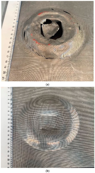 Experimentally deformed sheets at 18.750 KJ energy: (a) 0.5 mm sheet and (b) 1.02 mm sheet.