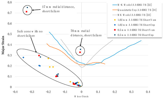 The experimental and simulated results of major and minor strain for 0.5-mm and 1.02-mm sheets at 10 different points (Figure 13) measured using a circle grid analysis is presented in Figure 14, along with the quasistatic FLD and high strain rate FLD from the literature. The experimental values of the strain were measured five times, and the average values are presented in Figure 14. Table 5 presents the measured strain values for the closed die electromagnetic forming. The FLD from the literature is based on the manufacturing of a dome, whereas the results from the current model are based on the closed die forming. Therefore, a direct comparison of the total strain from the closed die forming with the dome cannot be performed; however, the high strain associated with the sheet failure can be compared. It is observed that the major and minor strains predicted numerically were in good agreement with the experimental results. From Figure 14, it is evident that all the points marked on the 1.02-mm sheet lie in the safe forming zone, with few points in the insufficient stretch zone. However, in the 0.5-mm sheet, most of the points lie in the safe forming zone, except for two points at 17-mm and 70-mm radial distances from the centre of the sheet, which is above the safe zone (also highlighted in Table 5). From the literature, it is evident that the major strain is safe until 0.35 [35,36]. Although the simulation can estimate the location of possible failure, the model cannot predict the exact location of the fracture of the sheet or direction of the fracture, which highlights the need for a detailed micromechanistic fracture model and future model development.