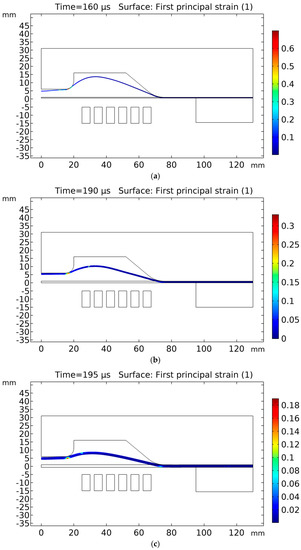 The effective plastic strain of the sheets was numerically estimated and presented in Figure 15. The effective plastic strain of the 0.5-mm sheet was 70% at 145 μs, as shown in Figure 15a. The maximum effective plastic strain of the 1.02-mm sheet was 31% at 180 μs, as shown in Figure 15b, and the maximum effective plastic strain of the 1.63-mm sheet was 18% at 195 μs, as shown in Figure 15c. From the results, it can be concluded that, even though the Lorentz force on a thicker sheet is the highest still, the effective plastic strain in the thinner sheets will be higher. A thicker sheet has a high rigidity and will need greater force to deform. The maximum strain in the electroforming of aluminium, as evident from the work of [35], can reach up to 35%. The forming limiting diagram of AA6061-T6 at a high strain rate also confirms the failure of the 0.5-mm sheet, in which the plastic strain reached up to 70%, which is very high from the estimated limits [35]. The effective plastic strain in repulsive magnetic forming is higher towards the centre of the workpiece [37]. The effective plastic strain is highest near the central region of the workpiece, where the die geometry changes abruptly; the thickness of the sheet has the lowest values at that region, as discussed by [17]; furthermore, the velocity of the sheet is also highest at the same region, which reveals the effect of effective plastic strain on the forming of the sheet. In general, the higher the effective plastic strain, the better formability due to inertial forces.