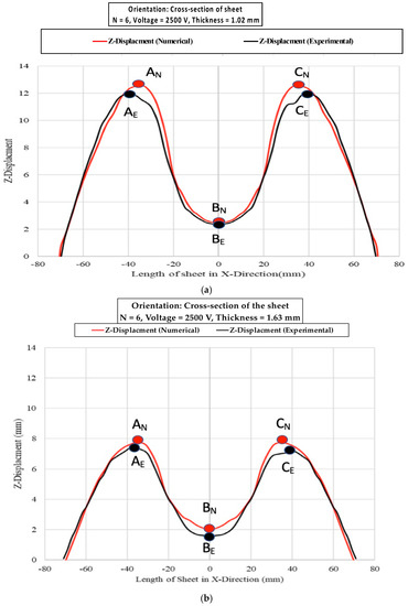 Numerical and experimental results (Z-Displacement): (a) 1.02 mm and (b) 1.63 mm.