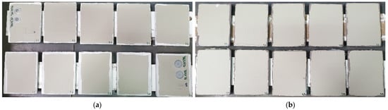 Corrosion resistance in marine conditions [13,18,19] was examined with an accelerated corrosion laboratory test in the Ascott S450 salt spray chamber (Ascott Analytical Equipment Limited, Staffordshire, UK). The salt chamber temperature was 35 ± 2 °C, the compressed air pressure was 0.7–1.4 bar, and the NaCl solution concentration was 5%, according to ISO 9227 [31]. The coatings degradation was continuously monitored during a period of 720 h after which examination was conducted according to ISO 4628 [32]. Coating systems after 720 h exposure in a salt spray chamber are shown in Figure 2. Upon corrosion testing in the salt spray chamber, pull-off tests were performed on each sample (Figure 3).