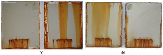 Corrosion on the edges was not considered. Coated samples displayed adhesion values between 4.7 and 6.6 MPa, with loss of adhesion between layers for system A, whereas system B completely detached from the substrate. Pull-off values for coating system A were basically the same, while the IR-dried system B sample showed better adhesion properties. Air-dried sample of system B did not pass the adhesion test because the value was below 5 MPa, according to ISO 19244-6 [34]. All samples had shown better adhesion prior to the salt spray test. Table 5 shows the coating thicknesses and the evaluation results of coating protection properties, and adhesion after 720 h testing in the salt spray chamber. Representative samples were chosen for the table since all tested coatings displayed similar corrosion properties in the salt spray chamber.