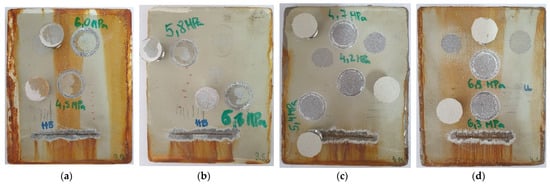 Pull-off testing on coated samples after 720 h of exposure in a salt spray chamber according to ISO 4624. Samples are represented as A1 (a), A2 (b), B1 (c) and B2 (d), according to the Table 2.