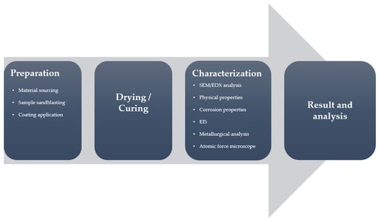 Waterborne (WB) two-component (2K) coating systems containing primer, intermediate, and a topcoat layer were evaluated. Infrared radiation was a method used to accelerate crosslinking of the coatings after which they were compared with the samples dried under atmospheric conditions. Required cleanliness Sa 2.5 and a medium degree of roughness, according to ISO 8501-1 [25] and ISO 8503-1 [26], was prepared with steel grit blasting abrasive on the steel test plates (150 × 120 × 8 mm). For each coating used in the research recommended thicknesses, overcoating intervals, gloss, and solids by volume are shown in Table 1. The coating thicknesses were achieved with spiral applicators according to the technical specifications provided by the manufacturer. The drying method, primer type, and manufacturer of applied coating systems are presented in Table 2. Physical and chemical properties of mild steel plates used for coating protection are shown in Table 3 and Table 4. Coatings used in this study are from German manufacturer Chemische Industrie Erlangen GmbH (CHING, Erlangen, Germany) and can be seen applied in Figure 1.