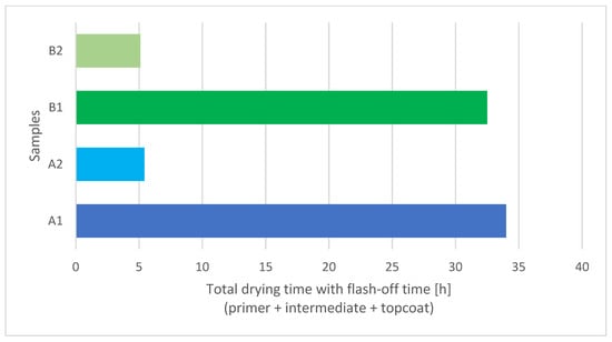 In this experiment flash-off time was set at 90 min before every IR curing process. Figure 5 shows a comparison between the total drying times of a waterborne three-layer coating system dried with IR (A2, B2) and under atmospheric conditions (A1, B1). IR drying times were up to six times shorter compared to overall minimum overcoating intervals at 20 °C from Table 1. The difference is even greater according to the manufacturer’s technical specification, which states that the coatings at 20 °C are fully cured after 7 days.