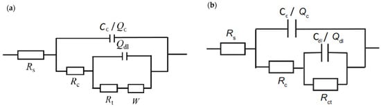 Equivalent electrical circuits used for the fitting of the measured data for (a) zinc-rich coating system A and (b) coating system B.