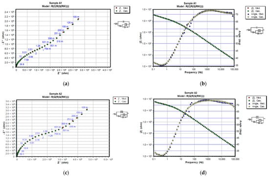 VersaSTAT 3 Potentiostat/Galvanostat (AMETEK Scientific 131 Instruments, Princeton applied research, Berwyn, PA, USA) was used to evaluate waterborne coating system protection properties via electrochemical impedance spectroscopy. The impedance spectra were obtained after 24 and 720 h in a 3% NaCl solution. The testing was performed at room temperature 23 ± 2 °C. The frequency range was from 105 Hz to 10−1 Hz. The working, reference, and auxiliary electrodes formed a three-electrode cell, where the coated sample was the working one, the saturated calomel electrode was the reference, and two graphite sticks were the auxiliary electrodes [14]. The working electrode had a surface of 19.6 cm2, while the counter electrodes had a 25.5 cm2 surface area. AMETEK ZSimpWin software was used to interpret the data. In order to check the repeatability of the data each measurement was executed in two replications.