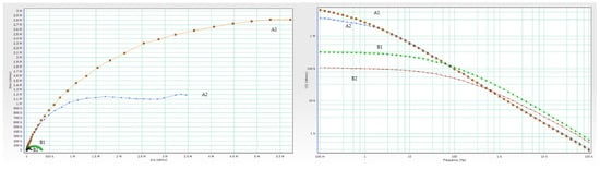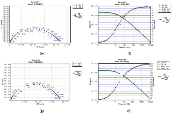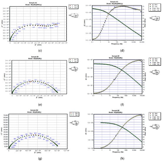 Representation of CNLS simulated and experimental data for each sample after 24 h in 3% NaCl solution with Nyquist and Bode plots. Nyquist diagrams are represented in (a) A1, (c) A2, (e) B1 and (g) B2, while Bode and Phase-angle plots are shown in (b) A1, (d) A2, (f) B1 and (h) B2.
