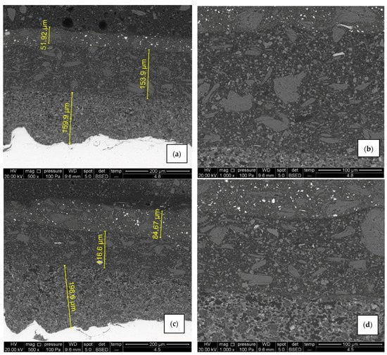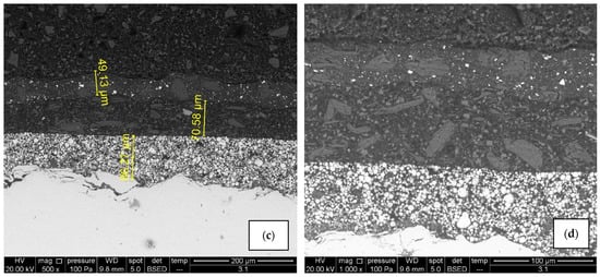 SEM micrographs of air-dried sample B1 (a,b) and IR- dried sample B2 (c,d), 500× and 1000× magnification. There are no visible signs of cracks and pores, adhesion is good and elements are evenly distributed in each layer.