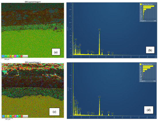 Surface morphology, pigment distribution, chemical composition, and coating thickness of the coated samples were examined by scanning electron microscope (SEM) with energy-dispersive X-ray spectroscopy. SEM micrograph in Figure 10a,b for sample A1 exhibits no defects (pores, cracks) through the layers, and the coating thickness correlates with the contact measurements. Also, good adhesion of Zn-rich primer to the substrate as well as good adhesion between layers was observed. EDX spectroscopy provided the elemental mapping in which various elements can be seen in each coating layer (Figure 11a,b). Zinc is uniformly scattered across the primer layer, C and O are present in all layers, the topcoat layer is pigmented with Ti, and Ca is distributed across the intermediate and topcoat layers. Mapping also shows Mg-Si-O inclusions evenly spread between two upper layers. All the elements correspond with the product data-sheet. Figure 10c,d show IR-dried sample A2 with no significant difference in adhesion, porosity, and coating thickness when compared to the air-dried sample A1. Cross-section elemental mapping of the IR-dried sample in Figure 11c,b exhibits equivalent elements distribution, meaning IR drying and curing did not negatively influence the distribution of the coatings.