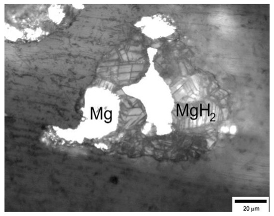Optical microscopy photograph of the etched metallographic section of a partially decomposed magnesium hydride (approximate bulk composition of the sample MgH1.3) [57].