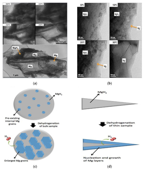 (a) Selected still frame TEM images from in situ video of high voltage (1000 kV) TEM of a ~2 μm bulk MgH2 particle taken at 300 °C, 420 °C, 430 °C, and 455 °C, and a low magnification bright field image of the sample (a single bulk powder particle) at 455 °C (bottom) [55]; (b) Selected still frame TEM images from in situ videos of conventional (200 kV) TEM through a thinned region (a few tens of nm) of an MgH2 particle taken at 50 °C, 150 °C, 250 °C, and 380 °C [55]; (c) Schematic multiple “nucleation and growth” hydrogen release mechanisms for bulk MgH2 grains [55]; (d) Schematic “shrinking core” hydrogen release mechanisms for thin MgH2 TEM samples [55].