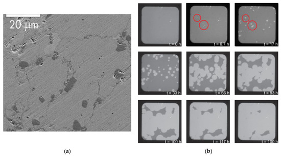 Gabis et al. [59] believed that for the dehydrogenation of non-metallic (ion-covalent) hydrides, the morphology of “nucleation and growth” is typical due to the fact that only a few nuclei appear relatively slowly and rarely form a skin as a result of the slow (compared to metals) hydrogen desorption, while for metallic ones, the “shrinking core” morphology is more common due to the fact that so many nuclei of the new phase appear and later form a solid skin of the new phase as a result of the fast desorption from the entire surface of the metal parent phase. This can lead to two suggestions: (1) The dehydrogenation of MgH2 should be controlled by the “nucleation and growth” mechanism because MgH2 is a semiconductor with a relatively large energy gap of 4.16 eV [60,61,62]; (2) The nucleation rate of Mg from MgH2 is the major cause that poses the argument between the “nucleation and growth” mechanism and the “shrinking core” mechanism, i.e., the difference in the nucleation rate in various MgH2 dehydrogenation experiments led to the fact that some experimental results were successfully explained by the “nucleation and growth” model while others by the “shrinking core” model. The evidence for the rationality of the last suggestion may also be served by the finding of Nogita et al. [55]. They performed an in situ ultra-high voltage transmission electron microscopy (TEM) on the Mg-Ni alloys to directly verify the hydrogen desorption mechanisms for MgH2. It was found by the authors [55] that the hydrogen desorption of bulk (2 μm) MgH2 particles proceeds as a result of the growth of multiple pre-existing Mg crystallites (nuclei) present due to the difficulty of the full transformation of all Mg during a hydrogenation cycle within the MgH2 matrix without the formation of new nuclei of Mg phase on the surface (Figure 3a,c). This agrees with the mechanism proposed by Evard et al. [57] for the desorption process of the partially hydrogenated magnesium. In contrast, in thin samples analogous to nano-powders (Figure 3b,d), hydrogen desorption occurs by a “shrinking core” mechanism.