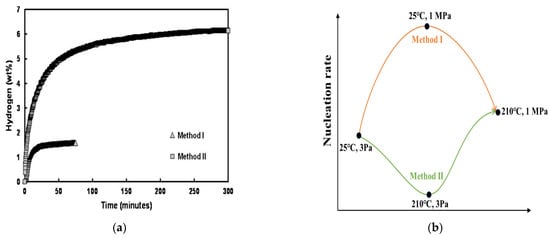 As mentioned above, the nucleation and growth behavior of MgH2 during hydrogenation of Mg can exert a significant effect on both the hydrogen absorption kinetics and the hydrogen storage capacity, implying the importance of choosing an appropriate preparation method and kinetic test conditions for hydrogen absorption and desorption. Tien et al. [82] performed two hydrogenation methods on the Ni-coated pure Mg powder in order to investigate the effect of the hydride nucleation rate on the hydrogen storage properties of Mg. In Method I, the specimen chamber was first pressurized with hydrogen to 1 MPa, and then the temperature was raised at the approximate rate of 12 °C/min from room temperature to 210 °C. While the second approach, Method II, consisted of first heating the specimen chamber under the low partial pressure of hydrogen (approximately 3 Pa) up to 210 °C and then increasing the pressure to 1 MPa. It was found that the hydrogen capacity and hydrogen absorption speed are much higher for Method II than for Method I (Figure 11a). Considering the characteristics of the driving force for MgH2 nucleation and the observation that the saturation of the hydrogen absorption is achieved when approximately more than 80% of the powders have a surface coverage by hydride of 80% or more, Tien et al. [82] believed that the lower hydrogen capacity of the sample prepared by Method I arises from the low temperature in the early stage of Method I. This leads to a high nucleation rate, and hence the small MgH2 colonies/grains densely distributed on the surface (Figure 11c,d). Furthermore, the higher hydrogen capacity of the sample prepared by Method II arises from the high temperature in the early stage of Method II, which led to the low nucleation rate and hence the large MgH2 colonies/grains dispersed on the surface (Figure 11e,f). Thus, for a given particle geometry, there are optimum hydrogenation temperatures and pressure that lead to a near-theoretical hydrogen capacity with a fast absorption rate. A scheme of the influence of hydrogenation methods, performed in the work of Tien et al. [82], on the nucleation rate is presented in Figure 11b. It can be seen that the nucleation rate for Method I is higher than the nucleation rate for Method II during the hydrogenation process.