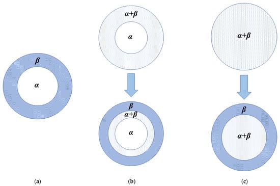 According to the readiness of hydride phase (β-phase) nucleation in the solid solution matrix (α-phase), three cases for the phase transformation process can be built [10,51,81] (Figure 12): (1) The two-phase coexisting region is absent (Figure 12a) with a quickly formed continuous β-phase layer on the outside of particles due to the easy and fast nucleation and growth of the β-phase in the α-matrix. This occurs when the volume expansion caused by phase transformation is low and nonequilibrium defects, such as excess vacancies, dislocations, grain boundaries, stacking faults, and inclusions, exist in the α-phase, leading to a low strain energy change. This also occurs when high hydrogen pressure and low temperature are applied because the low temperature allows a high nucleation rate. The high hydrogen pressure leads to a high hydrogen concentration gradient from the surface to the core, which causes preferential significant nucleation and growth on the surface. Then the β-phase grows toward the center of the supersaturation area, which is similar to the case described by the “shrinking unreacted core” model; (2) Three layers α, α + β, β coexist with the nucleation of the β-phase at multiple points inside the α-matrix (Figure 12b) when the β-phase nucleation is slow, but the β-phase growth is fast. This case occurs at a high temperature and high hydrogen pressure, with the high temperature predominating over the high hydrogen pressure in determining the nucleation rate. The high temperature allows a low nucleation rate, which leads to a wide region of hydrogen supersaturation in the matrix and, thereby, a simultaneous deposition of β-phase at multiple points in the supersaturation region, and the high hydrogen pressure-induced high hydrogen concentration gradient causes the preferential nucleation and growth on the surface (Figure 12b top). The continuous hydrogen diffusion from the surface to the center leads to the increasing width of the β-phase region and the decreasing width of the α + β two-phase region (Figure 12b bottom). It can be believed that if the growth of the β-phase is fast enough, the α + β phase region will disappear for a while, changing the pattern to the one in the first case (Figure 12a). However, the coexistence of three layers α, α + β, β should subsequently appear due to the slow nucleation of the β-phase; (3) The β-phase distributes throughout the matrix (Figure 12c) when the nucleation and growth of the β-phase are slow. This case occurs at a high temperature and low hydrogen pressure, with the low hydrogen pressure predominating over the high temperature in determining the growth rate. The low hydrogen pressure-induced low hydrogen concentration gradient and slow growth of the β-phase are unfavorable to the formation of the continuous β-phase layer on the outer surface. This leads to the fact that, unlike the situation presented in the second case (Figure 12b), the wide region of hydrogen supersaturation in the matrix caused by the high temperature expands all over the matrix. At a later stage, the hydrogen diffusion leads to the formation of the β-phase in the outer layer.