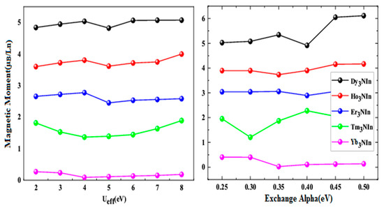 The structural, electronic, magnetic, and elastic properties of the Ln3NIn (Ln = Dy-Lu) lanthanide anti-perovskites nitrides were investigated utilizing the full-potential linear augmented plane wave method in the scaffold of DFT [19,20] using the WIEN2k software. In order to treat the correlation of the Ln-4f state electrons, the PBEsol functional contained by the Generalized Gradient Approximation (GGA) [21], GGA with Hubbard U (GGA+U) [22], and the B3PW91 flavor of hybrid function (HF) [23] were used. The Hubbard U value and exact exchange α were optimized in terms of magnetic moment per Dy-Lu atom, as shown in Figure 1a,b.