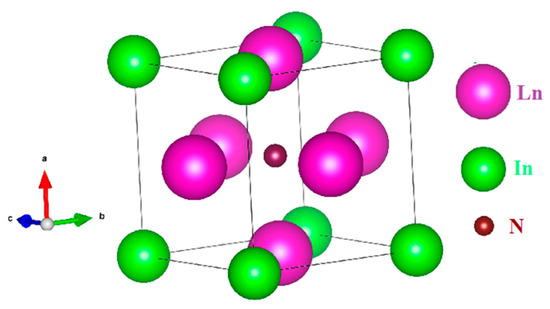 There is not much information on the physical properties of ternary nitrides with the formula R3NIn (R = rare-earth metal). Only the structural properties of these compounds have been experimentally reported [11,17], while the physical properties of R3NIn (R = Ce, Pr, and Nd) have been theoretically reported [18]. Structure parameters are experimentally reported for the anti-perovskites Ln3NIn (Ln = Dy-Lu) compounds in this series, which exist in cubic symmetry with the Pm-3m space group and have lattice parameters ranging from 4.979 to 4.812 Å. The distance between the rare-earth elements, their electronic arrangement, and the oxidation state within the compounds in anti-perovskite nitrides influence their magnetic properties. Although these compounds have been experimentally synthesized [11,17], there is no information available regarding their electronic, elastic, magnetic, or electronic properties. As a result, the current study aims to examine the structural, elastic, magnetic, and electronic properties of the understudy compounds using density functional theory because of their ability to withstand tensile stresses, exhibit metallic and ductile nature, and be used as biomaterials for skeletal reconstructions spatially when large acting loads are predictable.