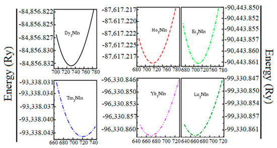 From Table 1, the computed lattice constants for Dy3NIn are in the range of 4.744 to 4.856, for Ho3NIn are in the range of 4.728 to 4.804, for Er3NIn are in the range of 4.684 to 4.769, for Tm3NIn are in the range of 4.644 to 4.731, for Yb3NIn are in the range of 4.632 to 4.718, and for Lu3NIn are in the range of 4.4.621 to 4.695. The ground state energies for Dy3NIn are in the range of −84,856.83297 to −84,856.53872 Ry, for Ho3NIn are in the range of −87,617.534213 to −87,617.12521 Ry, for Er3NIn are in the range of −90,444.208576 to −90,443.208576 Ry, for Tm3NIn are in the range of −93,338.043837 to −93,337.59376Ry, for Yb3NIn are in the range of −96,301.085485 to −96,299.93979Ry, and for Lu3NIn are in the range of −99,330.92911 to −99,330.78657Ry. The comparison between the estimated and experimental lattice constants is plotted in Figure 4 and given in Table 1, which demonstrates that the given results are in accordance with the experiments [11,17].