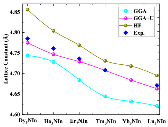 The lattice constants are decreasing for the understudy compounds from Dy to Lu due to changes in atomic radii of Dy to Lu atoms in Ln3NIn (Ln = Dy-Lu), as seen from Figure 4.