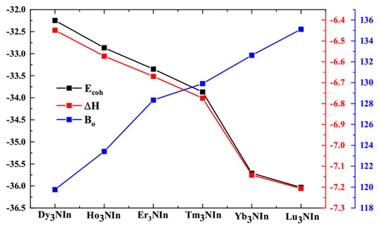 Cohesive energy and enthalpy of formation are plotted in comparison with bulk modulus for compounds Ln3NIn (Ln = Dy-Lu) [28] from Table 1 and Table 2 and shown in Figure 5.