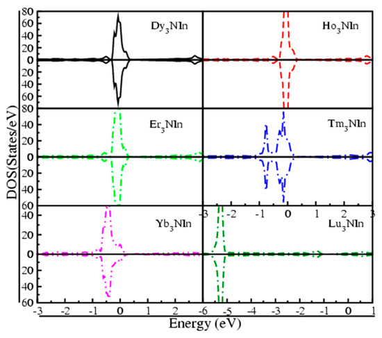 Partial DOS of the rare earth nitrides Ln3NIn (Ln = Dy-Lu) anti-Perovskite. Black, red, green, blue, magneta and dark green colors indicate the d and f state for Dy3NIn, Ho3NIn, Er3NIn, Tm3NIn, Yb3NIn and Lu3NIn.