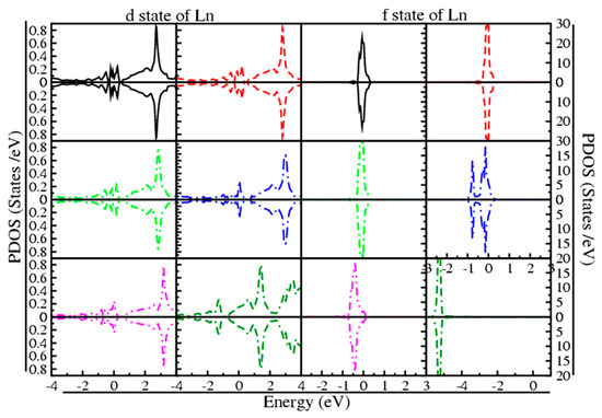 The contribution of Ln-d and f states to their metallic nature is also observed from their PDOS, as shown in Figure 8.