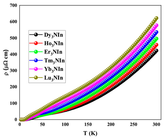 The electrical resistivity for Ln3NIn (Ln = Dy-Lu) is calculated using the BoltzTraP package [24] up to a 300 K temperature and presented in Figure 9.