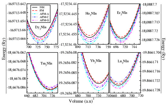 Figure 10 shows that the ground state energy of the C-type AFM of Dy3NIn is smaller than the other magnetic phases, indicating that this compound shows the C-AFM stable magnetic phase. Moreover, the ground state energy of the A-type AFM of Ho3NIn, Tm3Nin, and Yb3NIn is smaller than the other magnetic phases, indicating that these compounds show the A-AFM stable magnetic phase and the ground state energy of G-type. The AFMs of Er3NIn and Lu3NIn aresmaller than the other magnetic phases, indicating that these compounds show the G-AFM stable magnetic phase.