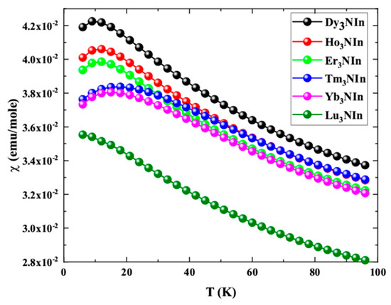 Boltzmann semi-classical transport theory [24] is used to determine the magnetic susceptibility (χ) for the understudy Ln3NIn (Ln = Nd-Tb) compounds embedded in the BoltzTraP program and is elucidated using the Curie–Weiss law [41] plotted in Figure 11.