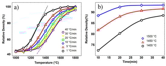 Figure 2a displays the relative density of the samples as the function of sintering temperature and time at different heating rates. The decrease in slopes, as there is an increase in heating rates, demonstrates the inverse relationship between densification speed and heating rate, typically, for most sintering cases. Figure 2b shows the curves of relative density vs. holding time at various temperatures. It can be seen that increased density of the sample could be achieved by prolonging the holding time. The relative density of the sample is identified to be about 94% after being sintered at 1500 °C for 20 min and kept almost stable by further increasing the holding time. The samples sintered at 1450 °C and 1400 °C exhibited the same sintering behavior, since the diffusion path, such as surface and interface which has low energy barriers, decreased gradually with the pore closure and grain growth. Since the temperature is much lower than the melting point, atoms and vacancies find it hard to overcome the high energy barriers of volume diffusion, resulting in an extremely slow rate of diffusion and densification in the later stage during the isothermal sintering.